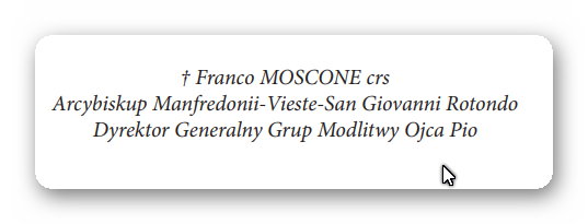 Pomóż nam, o chwalebny Ojcze Pio, wstawiać się za te wszystkie osoby – są one ciałem Chrystusa, są Eucharystią, której w tych dniach nie możemy przyjmować, są Eucharystią żywą, która przyjmuje postać osób słabych i cierpiących… Na ich twarzach jaśnieje Oblicze Syna Bożego, najsłodszego Jezusa Ukrzyżowanego i Zmartwychwstałego.